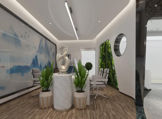 3、天花水波紋鏡面不銹鋼波光粼粼,倒影婆娑,中間點綴白色射燈,星光點點,仿佛仰望銀河,體驗區靠落地窗橢圓拱形網狀金屬鏤空材質,霧里看花,花更美,營造朦朧隱約東方詩意之境,呼應品茶洽談區中式嵌入式茶桌,讓顧客感受尊貴體驗同時一覽江景,身心徹底放松達到物我兩忘之境。辦公樓產品展示區蜂窩背發光造型突出展品的高科技品質感。辦公區裝飾設計:山水玻璃隔斷與綠植墻共同營造呼吸在山水綠意之間的意境,讓工作充滿詩意與生機,通透圓形玻璃與前廳區連接,運用借景設計手法,給空間帶來意趣。